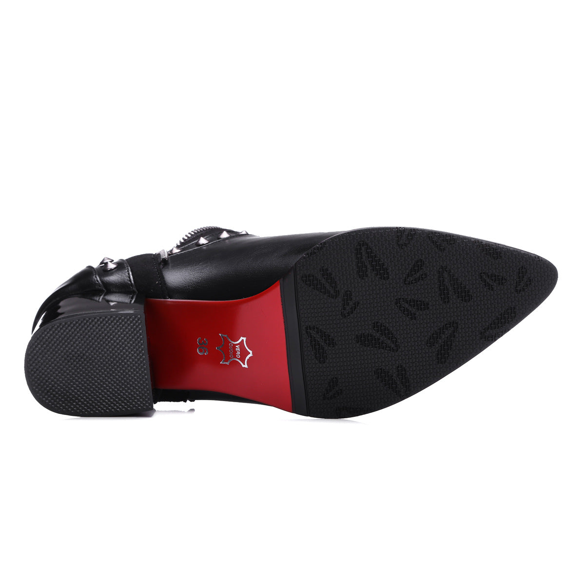 Sleek vegan leather, bold metal stud accents, and a sharp pointed toe come together in a boot designed to make an impact. A sturdy block heel adds height without compromising comfort, while side zippers provide easy wear.